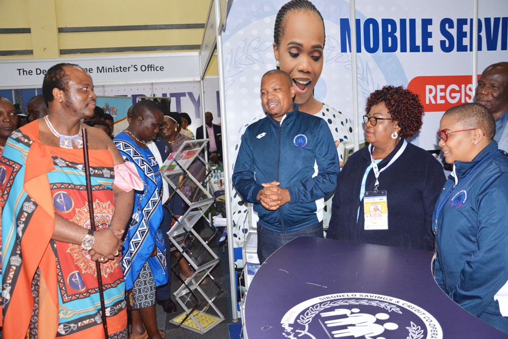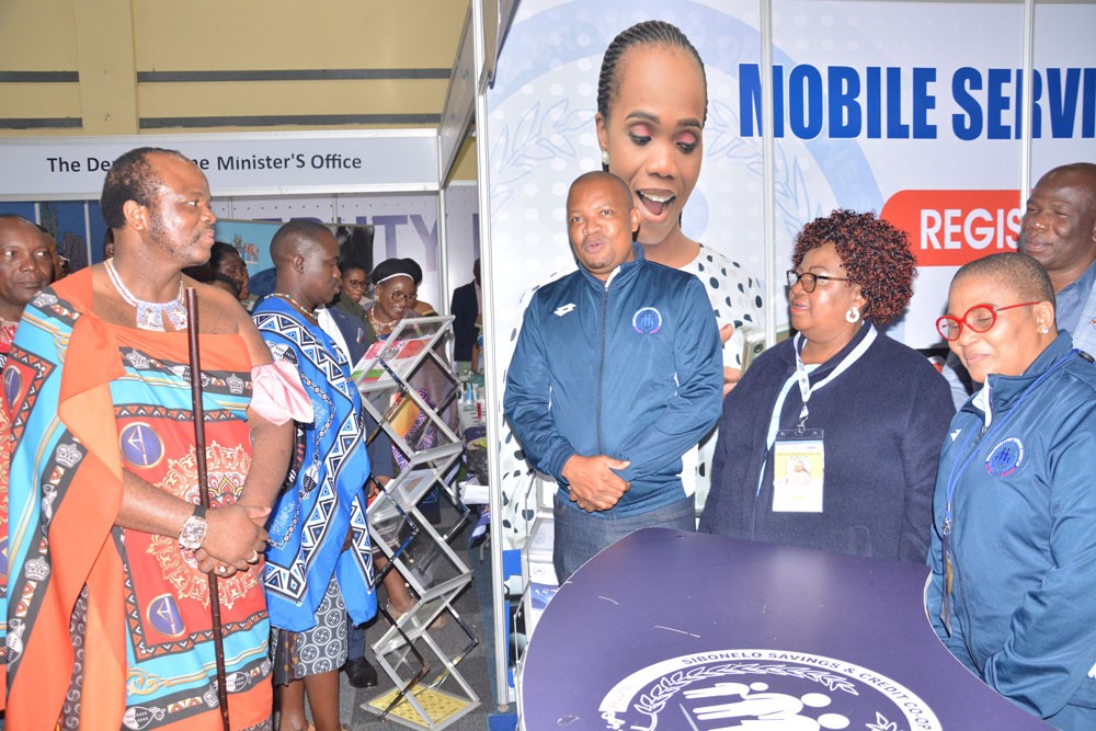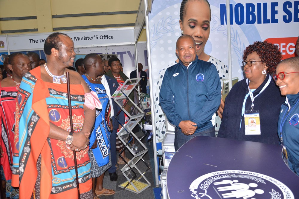 esitandini saka Sibonelo Savings & Credit Co-operative Society Ltd. Vice Chairperson Babe Menzi Dlamini ube nelitfuba leliyingcayizivele lekunika Imbube umlandvo wa Sibonelo while at the Eswatini International Trade Fair.